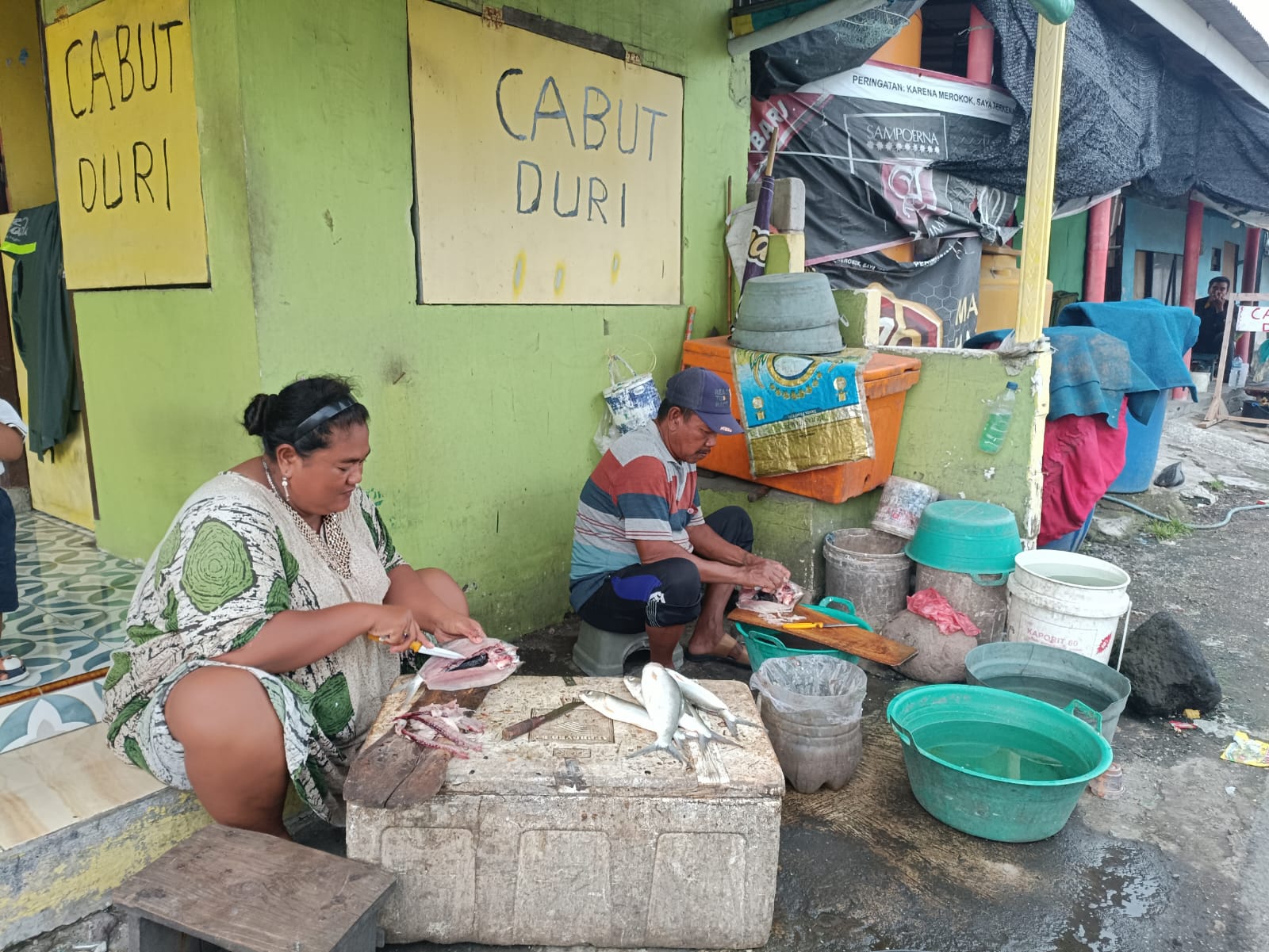 Ternyata tak hanya menyiangi dan membersihkan kotorannya, mereka berdua juga sedang bekerja sama membersihkan duri ikan bandeng. Lelaki dan perempuan itu ternyata suami istri. Sugiarti, menyayat daging dan “membuat jalan” di bagian dalam tubuh bandeng, agar duri-durinya jelas terlihat.
