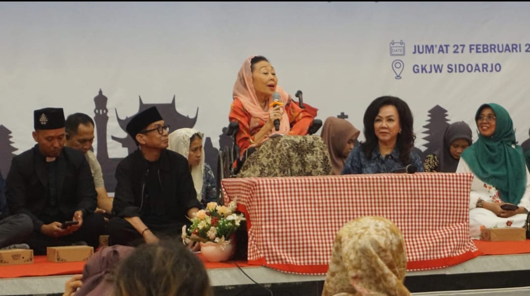 SIDOARJO, iNewsSidoarjo.id - Suasana hangat dan penuh kebersamaan mewarnai Gereja Kristen Jawi Wetan (GKJW) di Jalan Kombespol Duryat, Sidoarjo, Jumat 27/2/2026. Ratusan orang dari berbagai latar belakang agama dan profesi duduk bersila di atas karpet gereja, menanti waktu berbuka puasa dalam kegiatan lintas iman yang menghadirkan Shinta Nuriyah Abdurrahman Wahid.